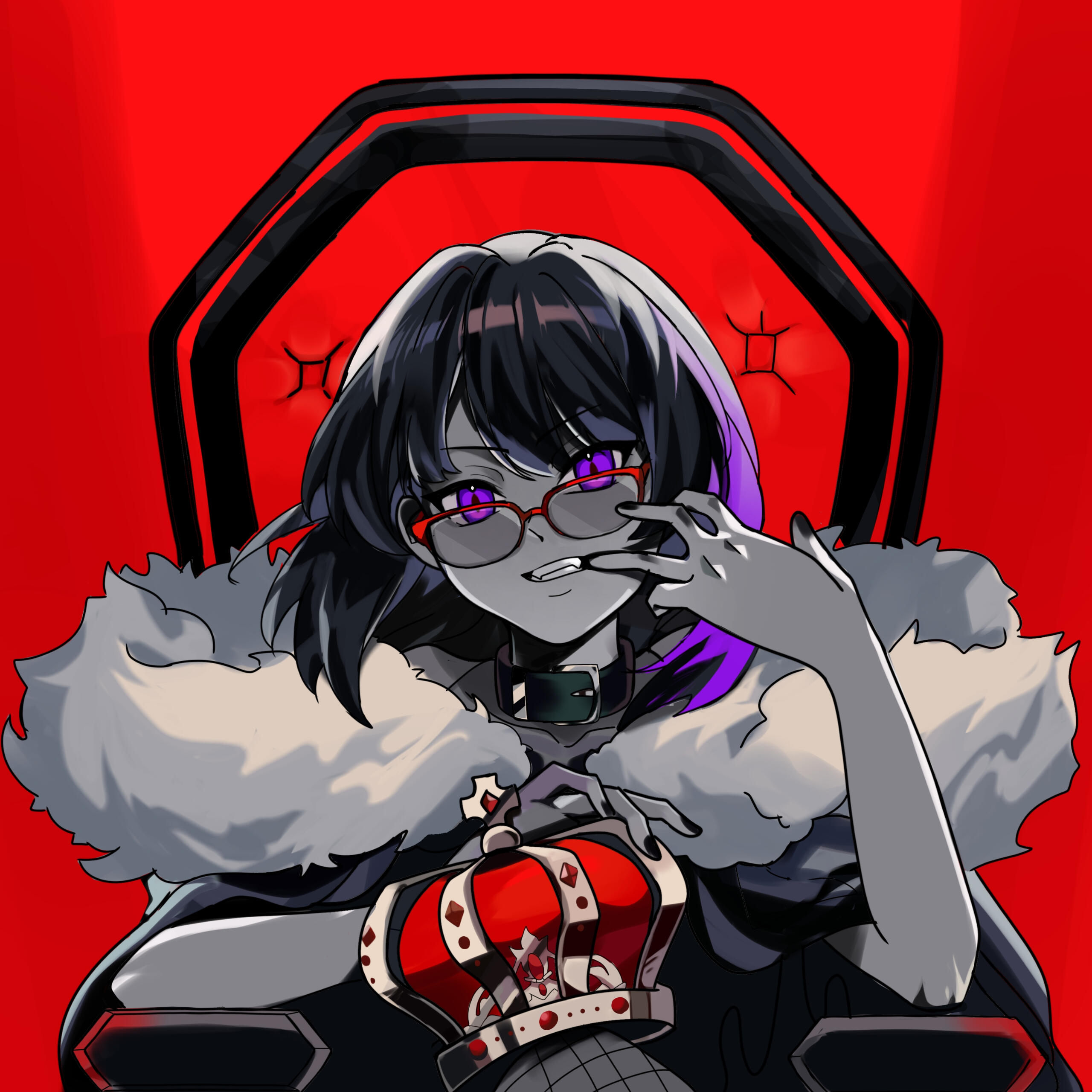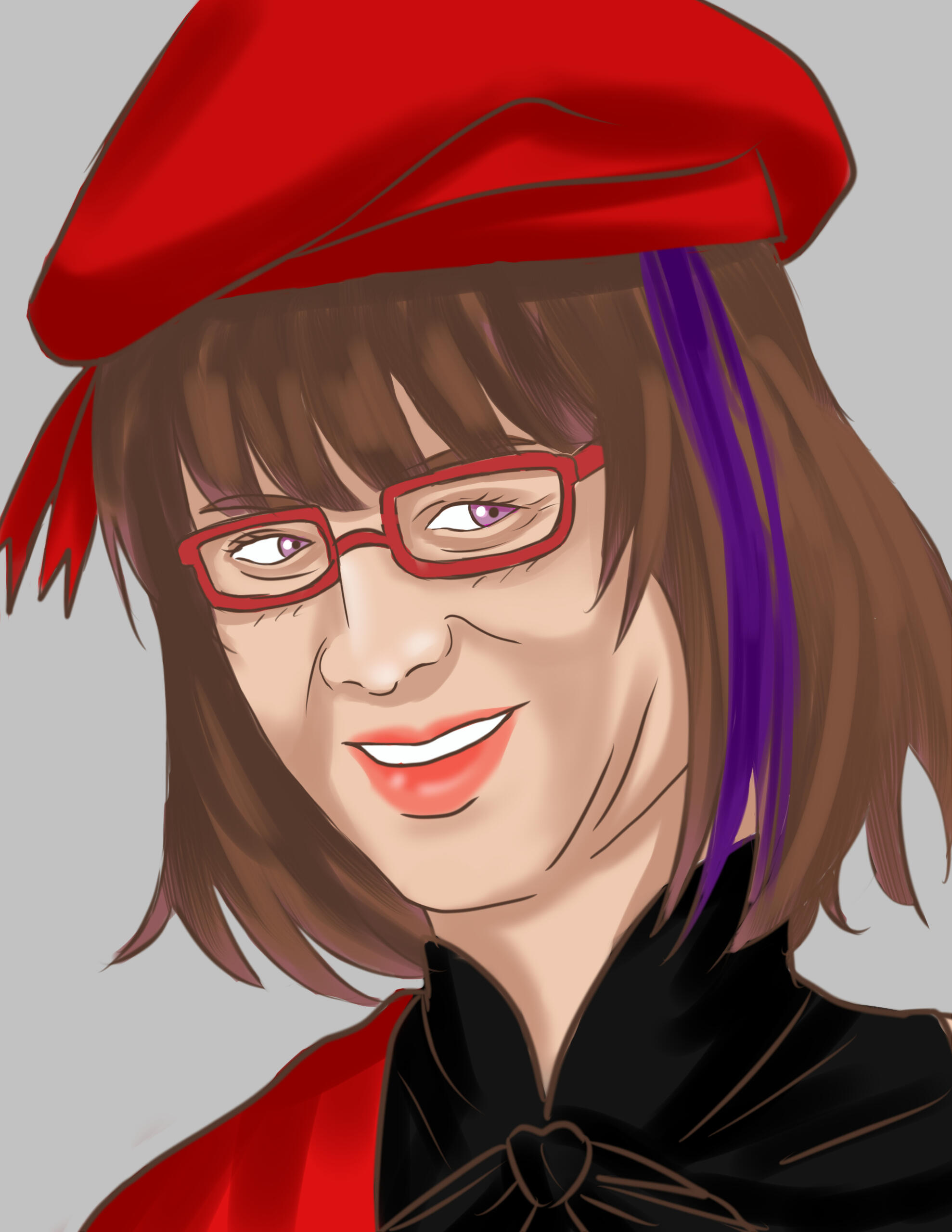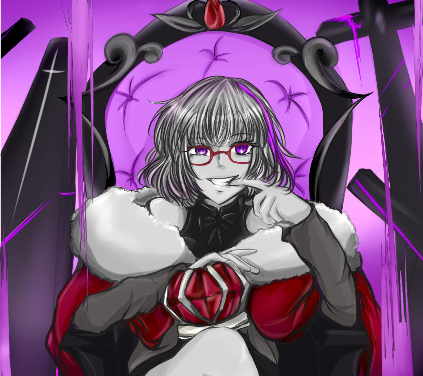 Her main color is purple, her attire usually red and black because it's associated with Rouge et Noir